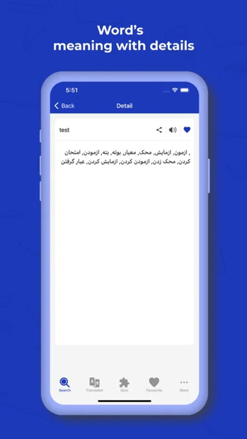 Explore an extensive vocabulary, user-friendly interface, English definitions, engaging quiz games, spoken English and English audio pronunciations. English to Persian Dictionary Offline and Translator Also provide the Translator to translate Persian text in to multiple languages.