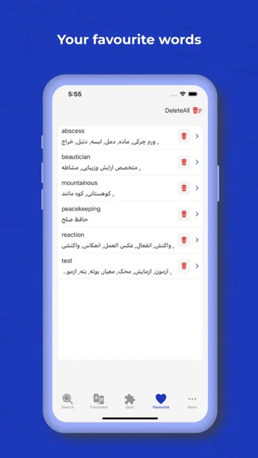 Save your favourite word meanings with ease! Just tap the heart icon, and we'll automatically add the word to your favourites list. Access your saved words effortlessly anytime you want through the 'Favourites' option in the tab bar at bottom. Enjoy quick and convenient access to your preferred words!"