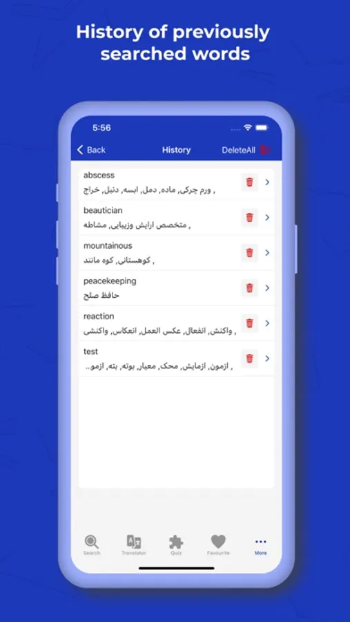 We take the history of previous searched words in English to Persian Dictionary Offline App. Easily access and review your past searches, making it a breeze to revisit and reinforce your vocabulary. With this indispensable tool, your language mastery becomes a seamless and efficient process.