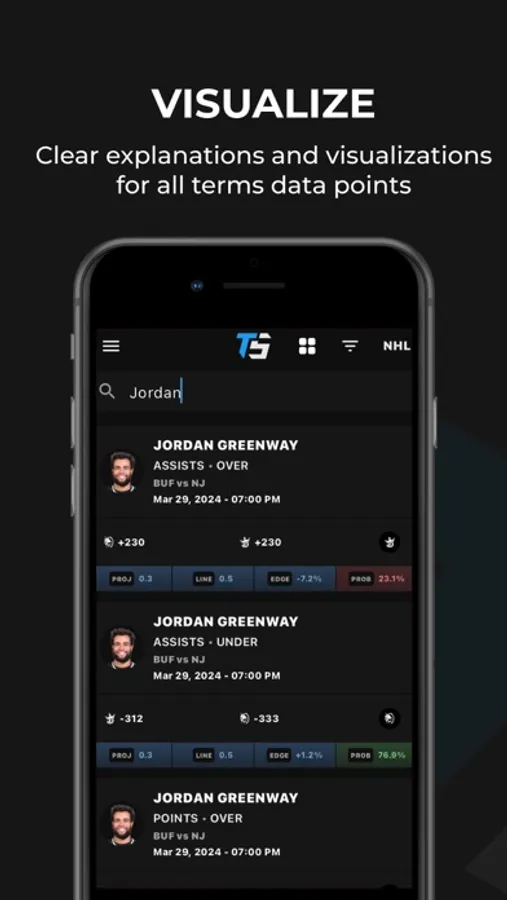 • Edge Calculation: Instantly see the difference between our calculated probabilities and the implied odds from sportsbooks to find the player and team props that have true value.