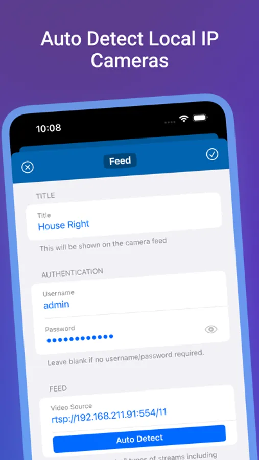 - Auto Detect Feature: Just give the app IP address of your camera with login information and Camera Feeds can detect video stream of the camera.