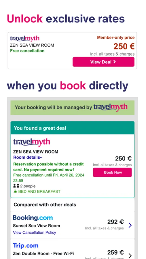 - Direct Booking: Not just a hotel meta-search search engine, Travelmyth also operates as an OTA, allowing you to book directly on our platform for many properties, simplifying your planning process and getting access to special rates.