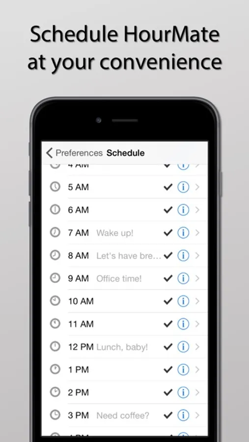 • Set on/off for each hour. So it's up to you if you don't want to be disturbed on your sleeping time, or if you want HourMate to alert you in every 2, 3, or 6 hours.