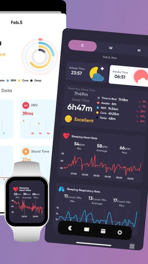 - Detailed sleep stage diagram (Awake, REM, Core Sleep, Deep Sleep) and sleep rate.