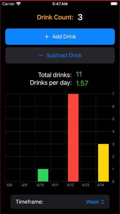- Single-page app with current drink count, counts/stats in a lookback period, and ability to add/subtract drinks.