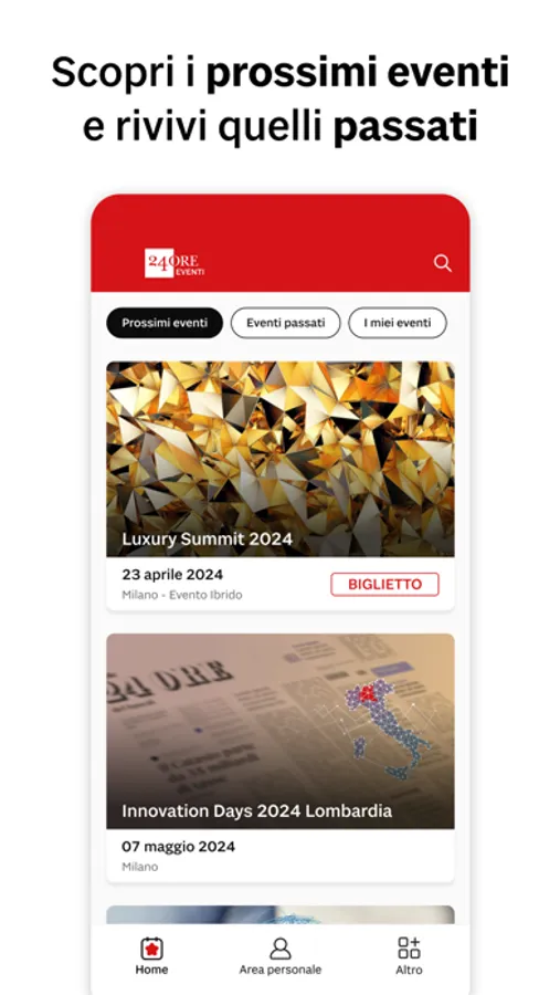 Nella HOME trovi tutti gli eventi in programma, sempre aggiornati in base alle novità. Le tre sezioni “Prossimi eventi”, “Eventi passati” e “I miei eventi” rendono ancora più agevole la User Experience e la ricerca degli appuntamenti di interesse.
