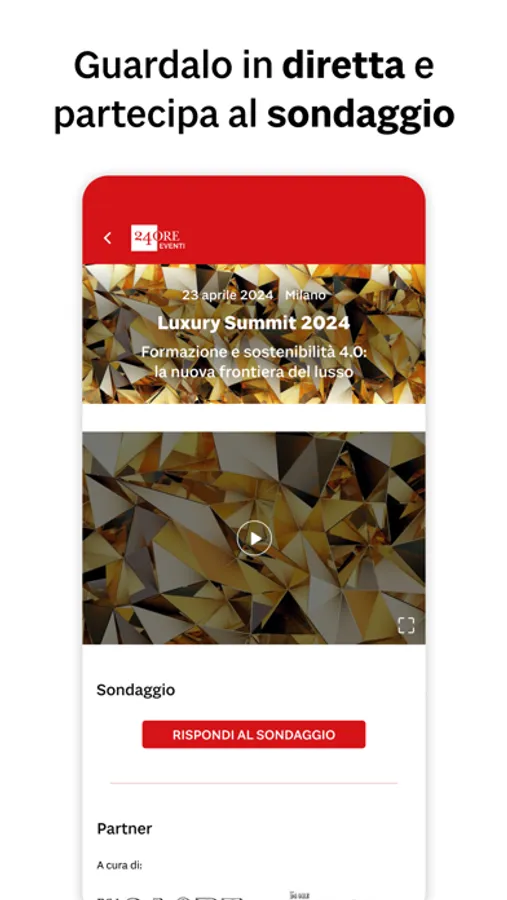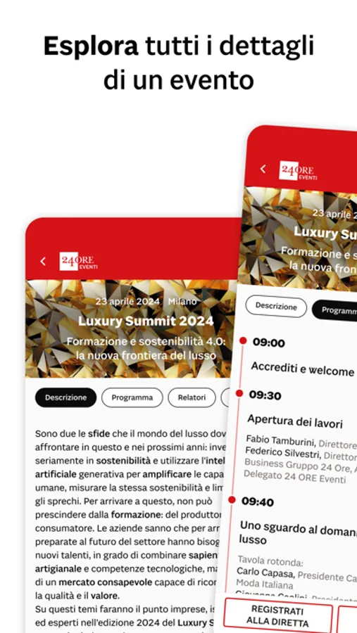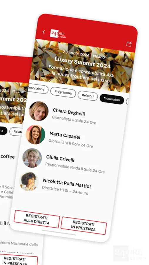 Convegni, Summit, Roadshow, ma anche progetti realizzati ad hoc per i clienti: all’interno dell’applicazione 24 ORE Eventi trovi tutti i Live Events, gli appuntamenti in modalità full digital e gli eventi ibridi Live&Digital a cui è possibile registrarsi e partecipare gratuitamente.