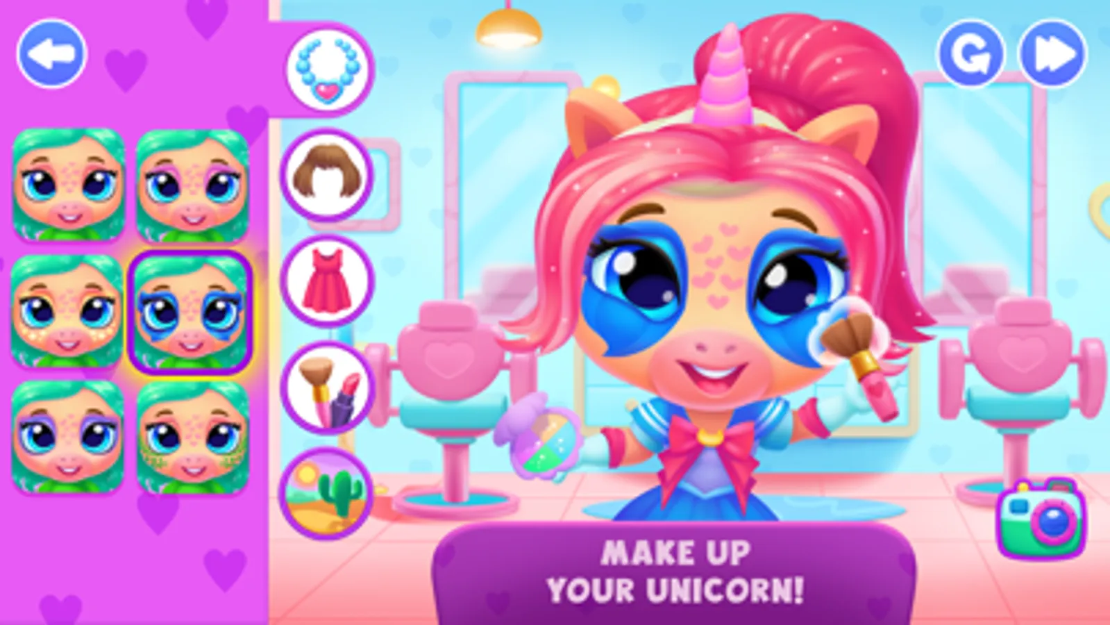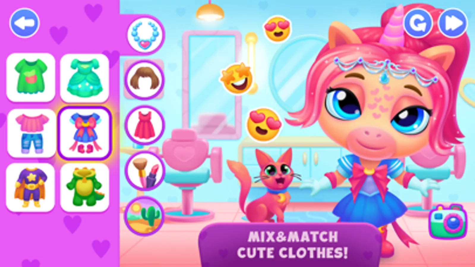 - Dress up unicorn with a variety of outfits and accessories