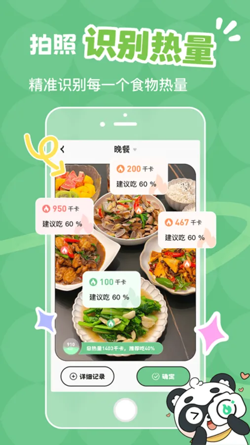 1.一键拍照识别:轻轻一拍,即可自动识别食物的热量和重量,告别繁琐的手动输入和查找。