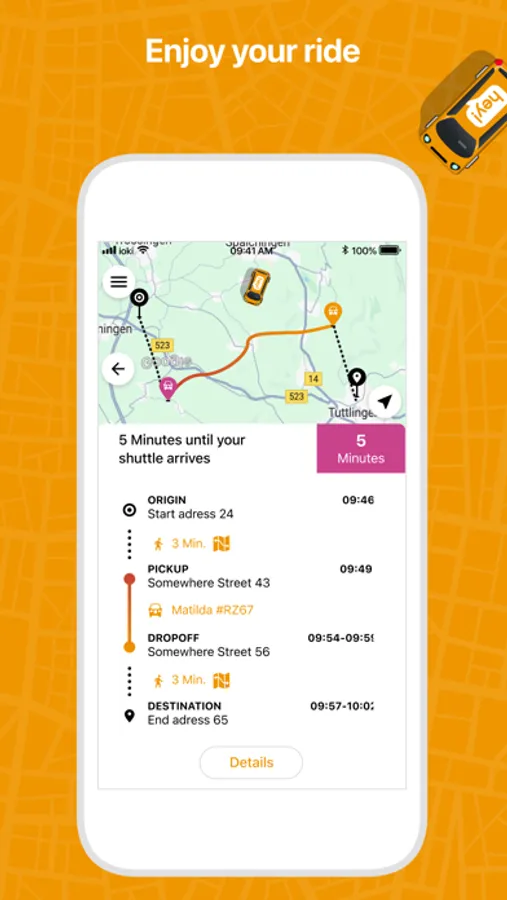 Book your flexible ride easily with the Hey! Move app from stop to stop.