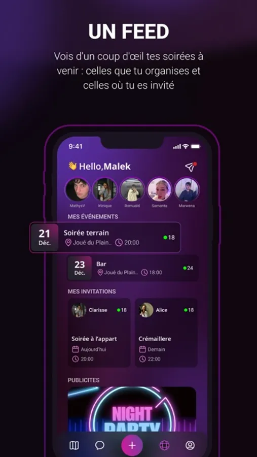 - Feed : Découvrez les stories des soirées de vos amis et restez informé des soirées à venir que vous organisez ou auxquelles vous êtes invités.
