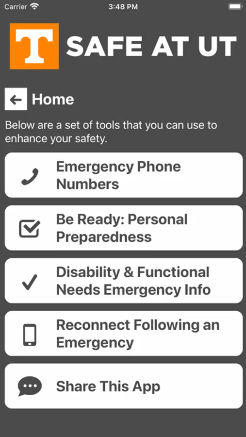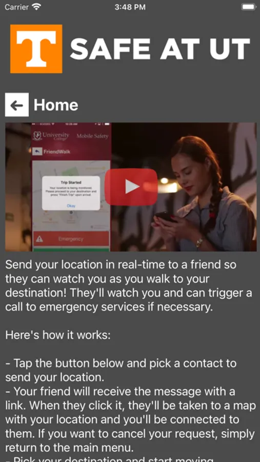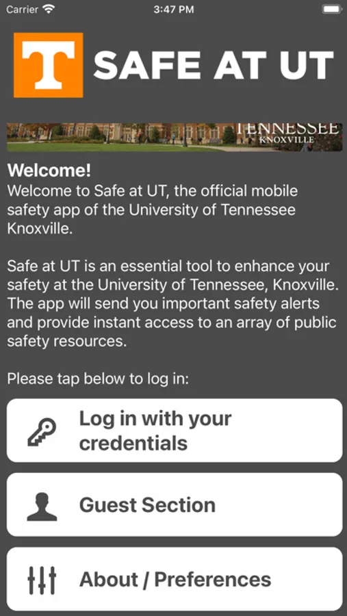 Safe at UT is the official safety app of the University of Tennessee Knoxville. It is the only app that integrates with the University of Tennessee Knoxville's safety and security systems. Campus Security has worked to develop a unique app that provides students, faculty and staff with added safety on the University of Tennessee Knoxville campus. The app will send you important safety alerts and provide instant access to campus safety resources.