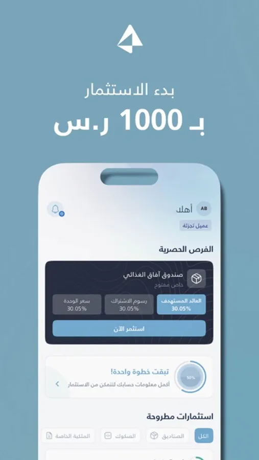 تطبيق آفاق المالية، منصتك الاستثمارية المتكاملة، حيث تجتمع استثماراتك في وجهة واحدة. سواء كنت مستثمر مبتدئ أو خبير، تقدر تستثمر، تدير، وتتابع كل منتجاتك بسهولة وشفافية.