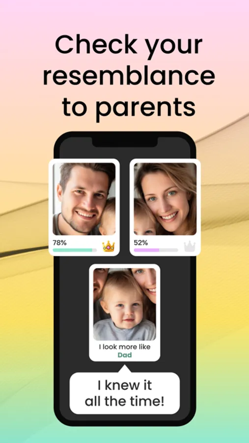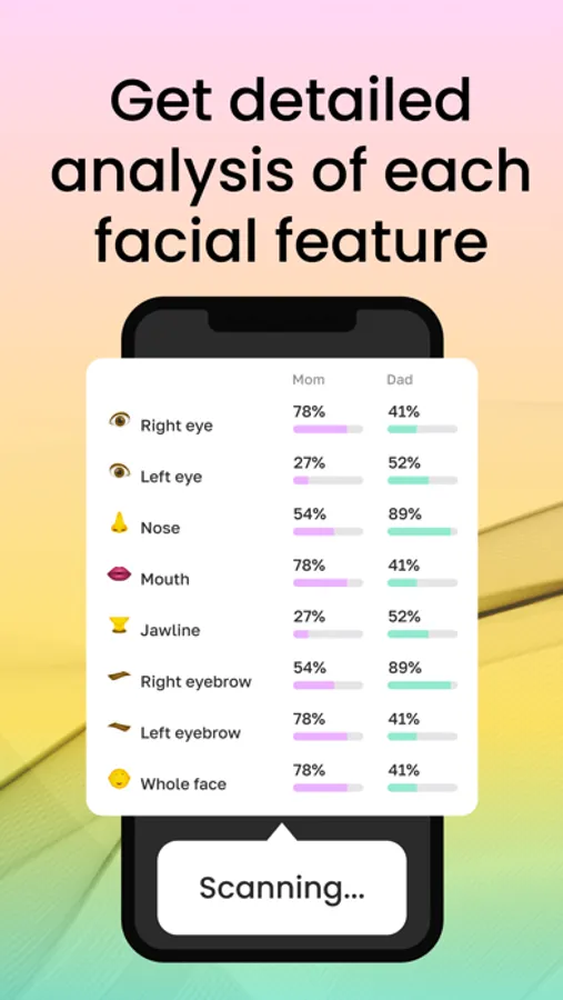 With Face Similarity, the guessing game ends. AI powered app provides a detailed analysis of each feature on your baby's face, revealing the resemblance to both parents.
