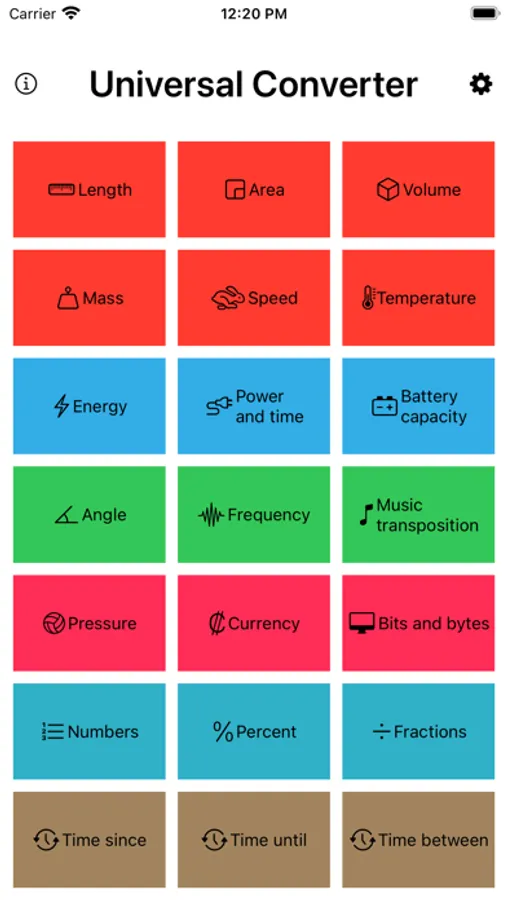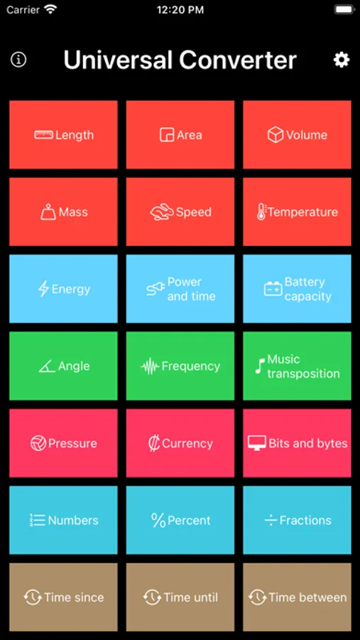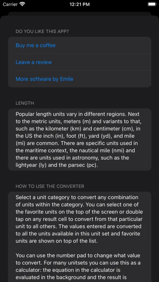 Unit sets include Length, Area, Volume, Mass, Speed, Temperature, Energy, Power and time, Battery capacity, Angle, Frequency (and wavelength), Musical transposition between instruments, Numbers, Percent, Fractions, Time since, Time until, Time between and Currency, Pressure, and Bits and bytes. More unit sets are coming. For each of these, a large variety of units are included. Units are shown abbreviated as well as written out, so it is easy to learn what the units refer to. The app is customizable to accommodate various preferences: in favorite units, and in how the units and values are displayed.