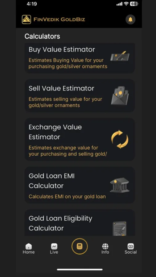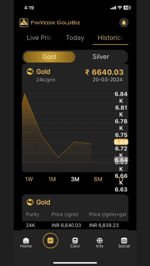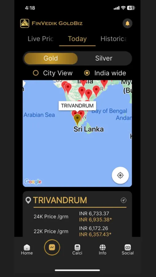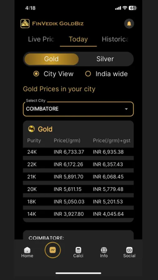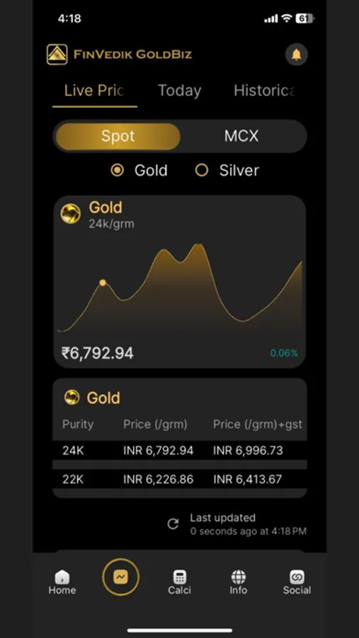 The Finvedik GoldBiz Gold Rate Today - India Live app is your ultimate one-stop solution for today gold price, today silver price, live spot market price, gold price predictions, gold silver historical prices, gold jewellers, hallmarking centres, gold buying calculator, gold selling calculator, gold exchange calculator, gold loan EMI, gold loan eligibility calculator, 10 grams gold rate, 1kg silver, gold market trends, daily gold rate across all top cities in India(Ex: Mumbai, Pune, Hyderabad, Bangalore, Delhi ), live gold rate, gold designs, gold offers, gold schemes, real time gold price alerts, 24k gold, 22k gold, 21k gold, 20k gold,18k gold, 14k gold, 990 silver, 999 silver, 970 silver, 958 silver, 925 silver, 800 silver, with/without GST 24k gold rate, 22k gold rate, 21 gold rate, 20k gold rate, 18k gold rate, 14k gold rate, 990 silver price, 999 silver price, 970 silver price, 958 silver price, 925 silver price, 800 silver price, SONA.