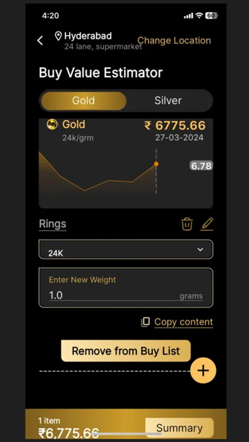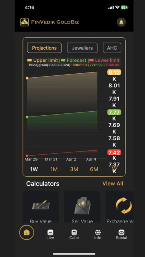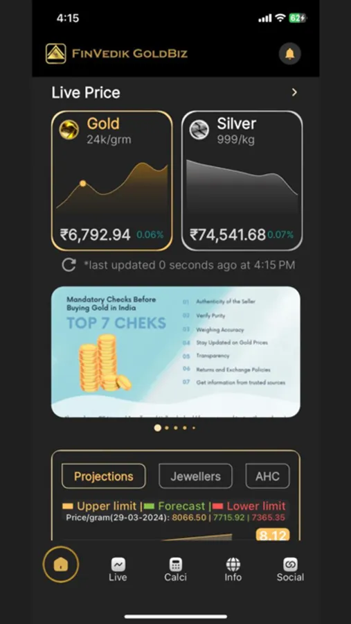 Top Benefits of FinVedik Goldbiz: Real-Time Gold/Silver Price Insights Get a live graph insights of gold/silver spot prices of 24k and 22k today gold rates (SONA), as well as 999 and 990 today silver rates, across all major cities in India with a Map/Table view. Access detailed gold 24k price, 22k price, 21k price, 20k price, 18k price, and 14k price, along with silver 999 rate, 990 rate, 970 rate, 958 rate, 925 rate, with options to include/exclude GST. Along with insights into gold today, historical price trends and future predictions, receive daily price notifications for investment decisions. Set customized gold/silver daily price alerts for cities like Pune, Mumbai, Coimbatore, Madurai, Ahmedabad, Delhi, Patna, Bhubaneswar, Jaipur, Chennai, Hyderabad, Lucknow, Kolkata, Vijayawada, Kochi, Visakhapatnam, Trivandrum and Bangalore etc. Comprehensive Gold, Silver Tools Use gold, silver calculators to estimate buying, selling, exchange values of precious metals. Gold Loan Eligibility Calculator, Gold Loan EMI Calculator helps in investments and loan options. Jewellery Trends, AHC Get latest jewellery offers, schemes, designs from nearby jewellery shops, digital gold and daily notifications for best deals in the gold, silver market. Gold, Silver India’s Market Insights Get market news, trends impacting gold/silver investments. Explore informational (ex: Hallmark, HUID, BIS etc) videos, blogs, and social media.