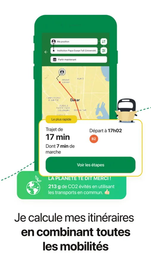Retrouve dans une seule application les informations des lignes de Dakar. Calcule un itinéraire, prépare ton voyage, achète tes titres de transport et valide-les avec ton smartphone.