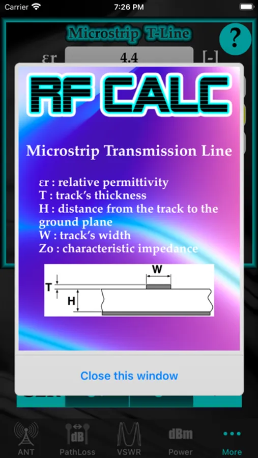 6) Microstrip Transmission Line : you can compute the characteristic impedance of a microstrip transmission line, or solve other parameters (relative permittivity, track’s thickness, distance from the track to the ground plane, or track’s width).