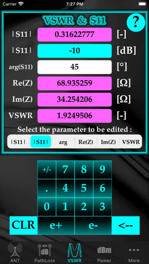 3) VSWR & S11 : you can compute the voltage standing wave ratio or solve other parameters (modulus of reflection coefficient (linear or logarithmic), argument of reflection coefficient, real part of input impedance, imaginary part of input impedance).