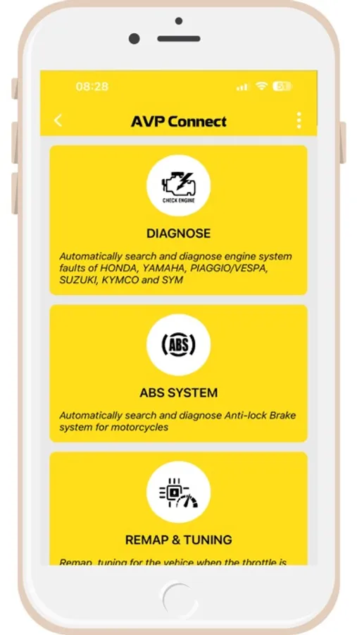 AVP Connect includes read trouble code and remap/tuning functions for HONDA, YAMAHA, PIAGGIO/VESPA: