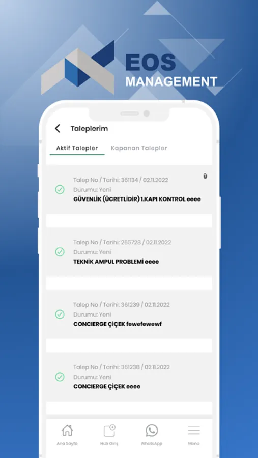 • Taleplerim; Teknik, Güvenlik, Temizlik, Bahçe Bakım vb. hizmetlerinde tespit edilen olumsuz durumların fotoğrafını çekerek iş talebi oluşturma,