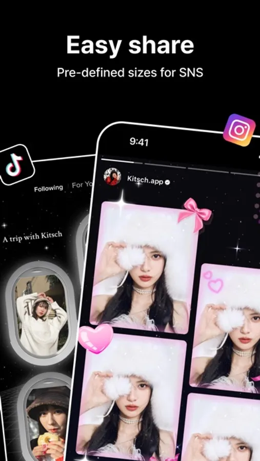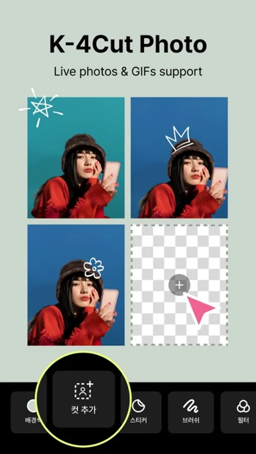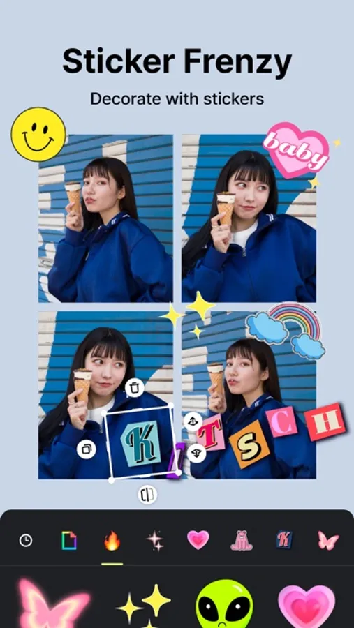 Create your own Kitsch-style four-cut photo with various stickers and live photos.