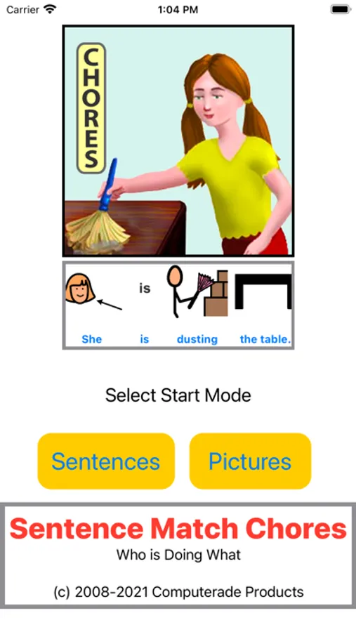 Sentence Match Chores is the same as the orginal Sentence Match but with 91 new sentences and pictures based on daily living skills.