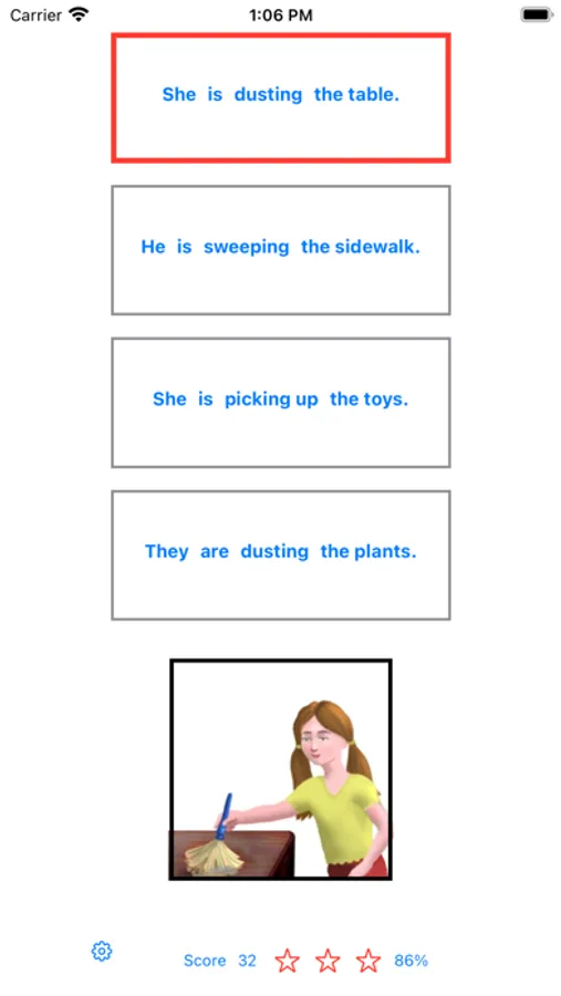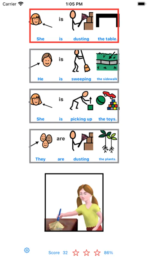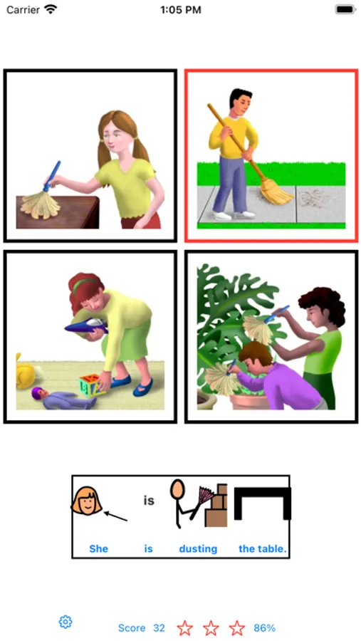 Choose from 4 sentences to match the picture or, choose from 4 pictures to match the sentence. Sentences can be displayed as text and/or PCS symbols at 3 difficulty levels. An animation with speech feedback reinforces the correct match. Correct matches add to the score. Teachers or aides can easily set the difficulty level, choices and other options.