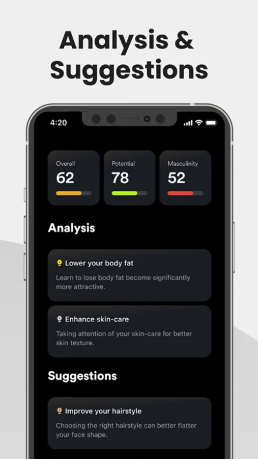 - Tailored Suggestions: Get customized suggestions to improve your features, with tips on grooming, skincare, and style.