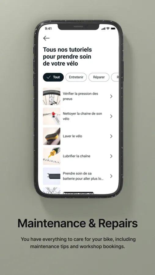 Optimize your bike's longevity with our care tips and tutorials. The maintenance tips enable you to proactively take care of your bike, reducing the risk of breakdowns and prolonging its life. In the event of a problem, you can book an appointment with the nearest workshop directly in the app.