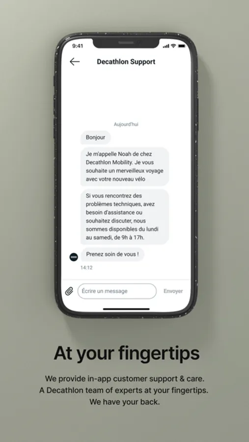 Decathlon at your fingertips! Need help or advice? The app puts you in touch with our team of experts, there to support you at every stage of your bike's life, whether it's for technical questions, a theft report, advice on use or personalized recommendations.
