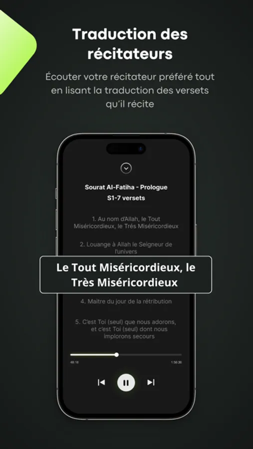 - la traduction synchronisée des récitateurs : écoutez les meilleurs récitateurs du monde tout en lisant la traduction des versets qu'ils récitent.