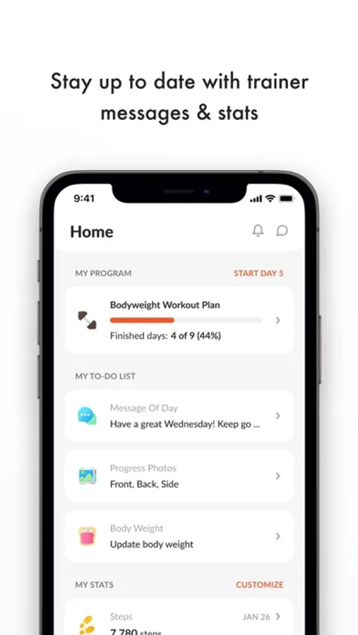 From the home page, view the messages from your fitness coach, view your daily fitness statistics, and see your daily nutrition overview. On this page, we also work with the Apple Health App to keep track of your steps and calories burned.
