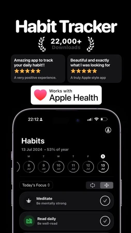 Transform your daily routines with Haby’s intuitive design and powerful features. Track your habits seamlessly with Apple Watch and interactive home screen widgets.