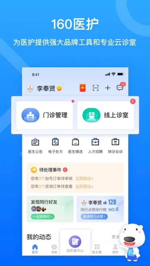 160医护是由国内领先的互联网医院平台健康160打造的医护网络执业平台,也是帮助医护快速开展互联网服务的网络诊室。不仅提供强大的六合一内容工具,帮助医护快速打造个人品牌,同时也提供专业、高效的诊疗及患者管理工具,更可通过图文、电话、视频等多种方式线上问诊、开药,充分提升阳光收入。