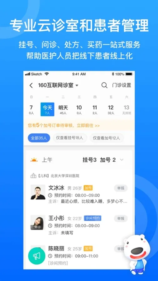 【预约管理】医生可开放线上预约通道,实现多点自主排班,挂号加号双自由,为医生提供更加便捷的预约管理服务。