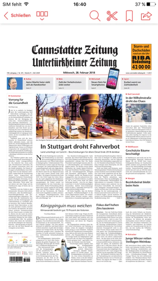 Lesen Sie mit der digitalen Ausgabe der Cannstatter Zeitung und der Untertürkheimer Zeitung täglich bereits ab 19 Uhr das Wichtigste aus Stuttgart und der Region. Ab 05 Uhr steht Ihnen die Gesamtausgabe mit Informationen aus aller Welt Zur Verfügung. Die ePaper-App bringt Ihnen die Zeitung in originalgetreuer Darstellung auf Ihr iPad und iPhone. Die fürs digitale Lesen optimierte Benutzeroberfläche und viele nützliche Zusatzfunktionen bieten täglich ein komfortables Leseerlebnis.