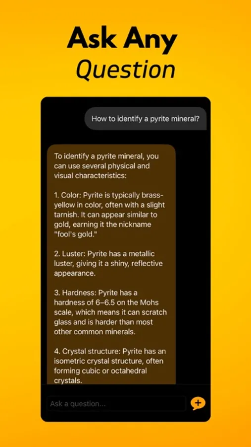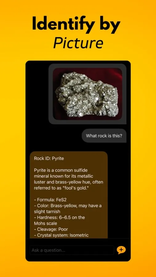 Have burning questions about a specific rock or mineral? Ask anything about the identified specimen, and receive knowledgeable responses instantly. Whether you're curious about its geological history or practical applications, our expert has you covered.