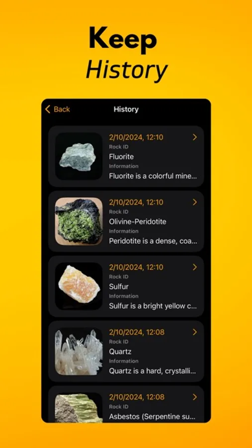 Keep track of your exploration journey with our built-in history feature. Review past identifications, revisit detailed information, and continue your geological discoveries seamlessly.