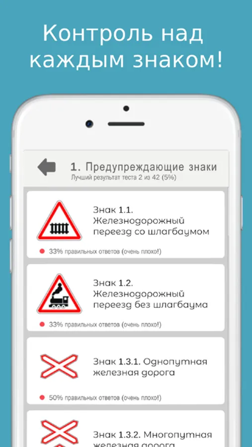 Мы контролируем ответы на каждый из знаков, а также считаем общий процент изучения раздела.