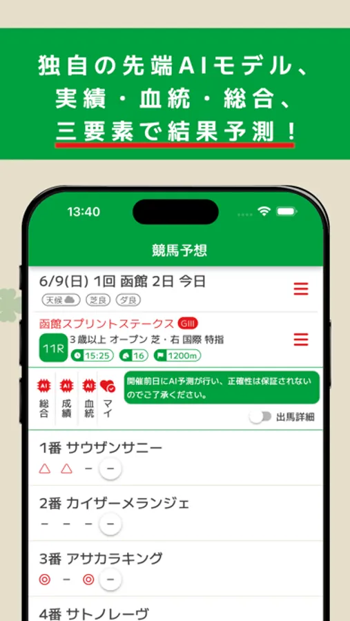 ・独自の AI モデルと豊富な直近データで実績・血統・総合三要素で AI 予想。