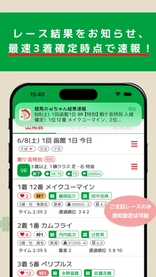 ・レース結果をお知らせ、最速 3 着の確定時点で速報。
