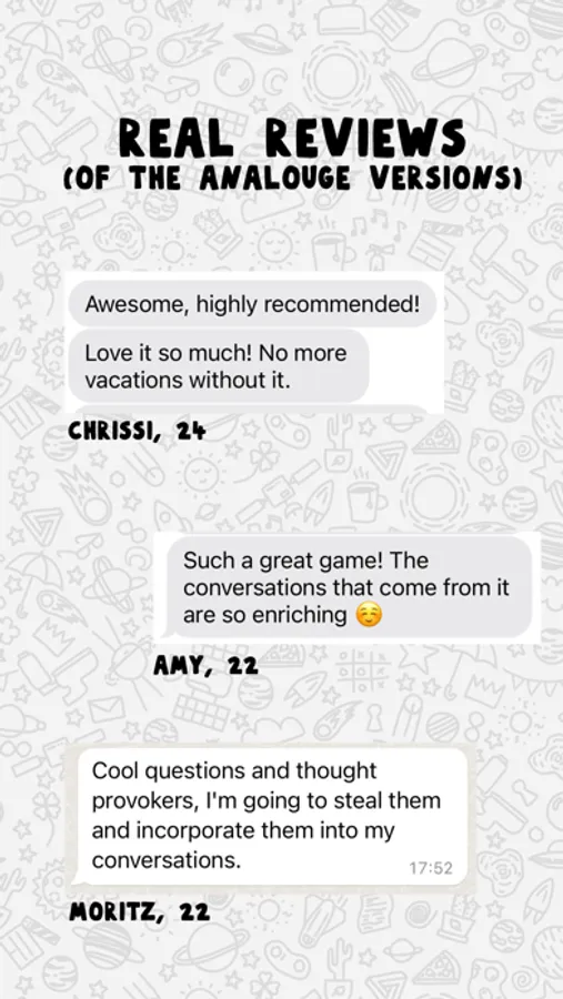 Engaging Question Decks: Each deck is carefully hand-crafted to suit different social settings and relationship stages.