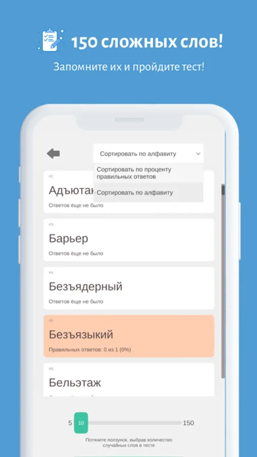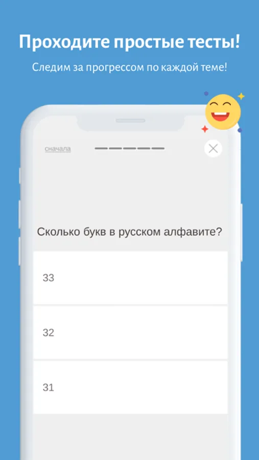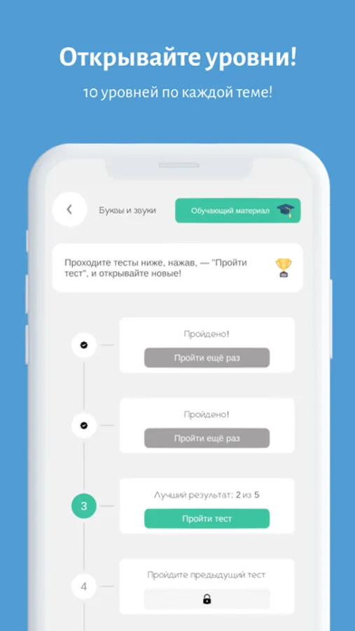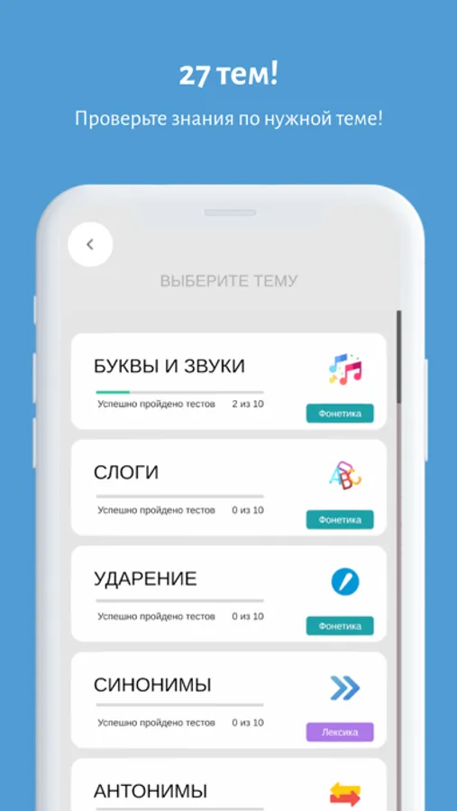 The entire Russian language is divided into 27 sections, each section has 10 tests. Each new test is unlocked after passing the previous one.