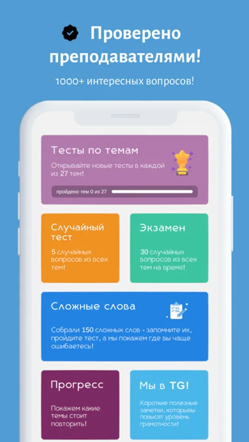 Each section contains unique tests, for example, you will find various simulators that allow you to better remember the rules, or study spelling, learn to identify parts of speech, understand where and why you need to insert certain letters and many other tasks!