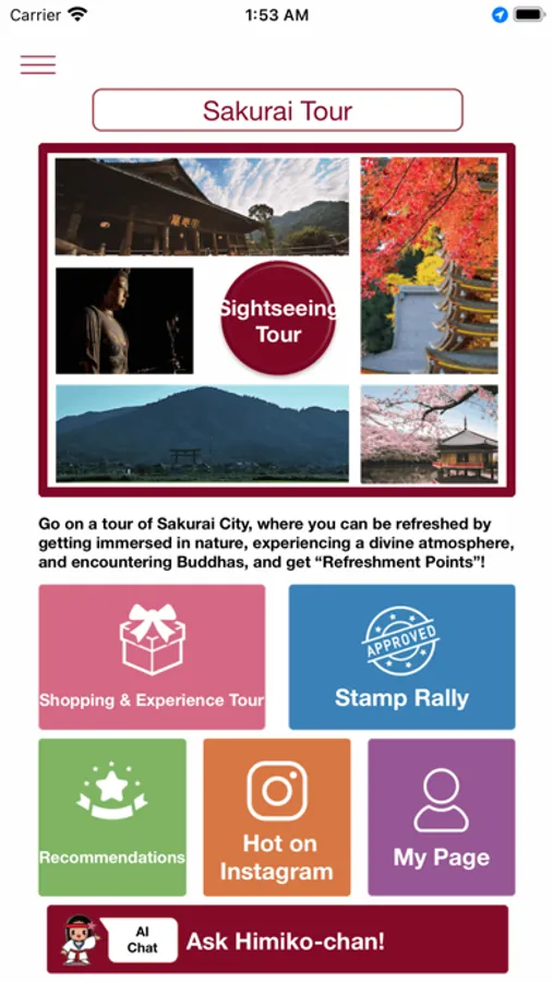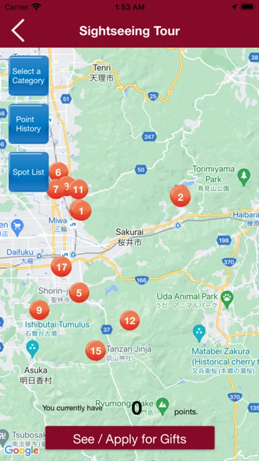 This application enables you to obtain reward points and stamps by making a tour of attractive tourist destinations in Sakurai City. Reward points are also awarded when you use the tracking function of this app to track your routes on foot or by bicycle in Sakurai City. You can use points and stamps you have obtained to apply for gifts.