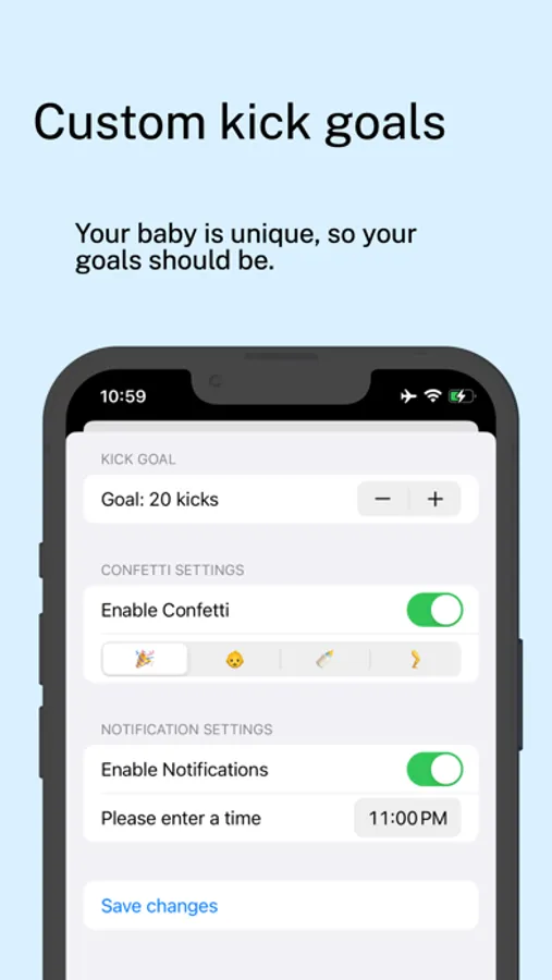 - Customizable Kick Goals: Every pregnancy is unique, and so is every baby! That's why our app lets you personalize the number of kicks you aim to count, ensuring the tracking experience is perfectly tailored to you and your baby's needs.