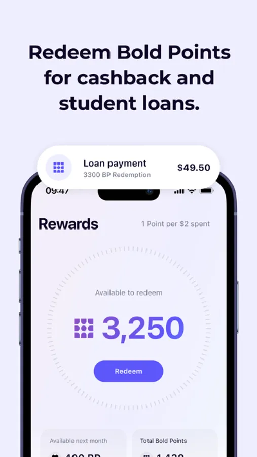 Get paid earlier with Early Pay, redeem rewards for cashback and student loan payments, transfer funds, manage your Bold Debit Card, and more. Enjoy exclusive banking services and innovative features that help you pay for school.