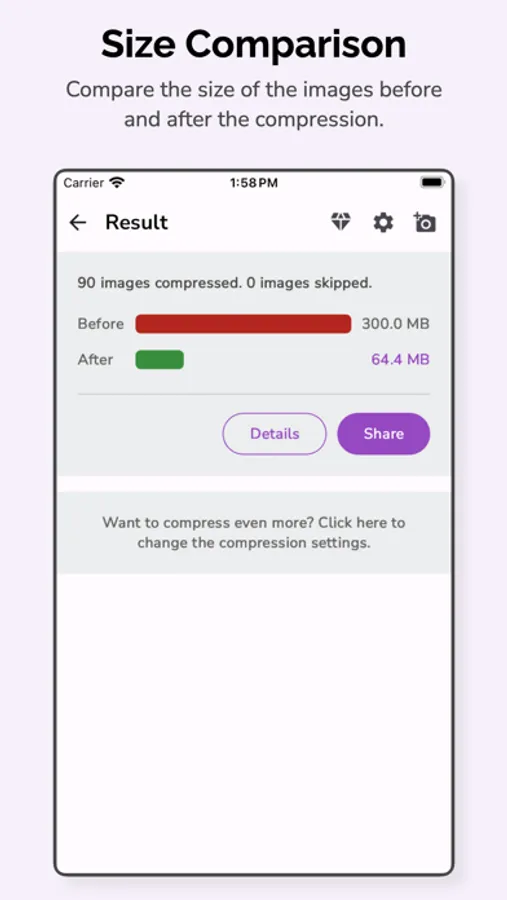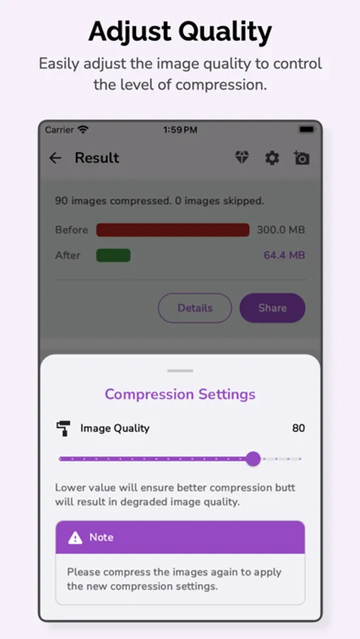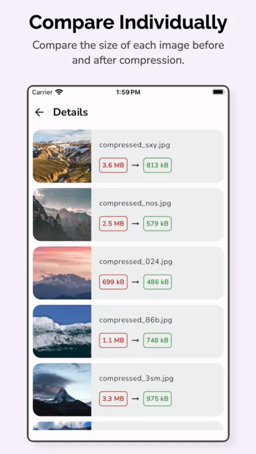 Images compressed via Image Compressor can easily be shared with your friends and family over social networks or via email without worrying about the size limits.